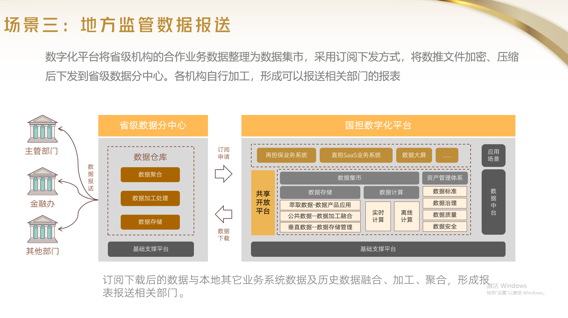 元明科技副總經(jīng)理王開燦重點(diǎn)介紹了“國擔(dān)基金省分中心方案”,他表示,省數(shù)據(jù)分中心技術(shù)架構(gòu)與國擔(dān)基金直擔(dān)SaaS平臺一脈相承,按照“互聯(lián)網(wǎng)+擔(dān)?!钡脑O(shè)計(jì)理念,將進(jìn)一步擴(kuò)大數(shù)字化平臺的開放程度,通過“1+2+N”的數(shù)字化生態(tài)平臺,將有效實(shí)現(xiàn)央地?cái)?shù)據(jù)中臺互聯(lián)互通和數(shù)據(jù)共享,實(shí)現(xiàn)地方監(jiān)管數(shù)據(jù)對接、銀擔(dān)系統(tǒng)直連、業(yè)財(cái)對接等個性化需求和屬地化需求,將有力提升公司和合作機(jī)構(gòu)的精細(xì)化管理水平及風(fēng)險(xiǎn)防控能力。